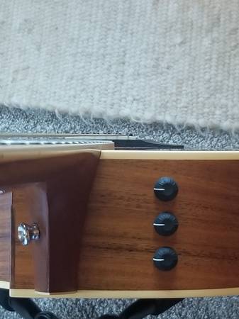 In addition to the Hawaiian koa on the top, back and sides, the neck is tropical American mahogany, the fretboard and bridge are both ebony. Because koa wood is so attractive, I had the original pick-guard taken off by the dealer and replaced it with a clear one. As you can see, the guitar has satin sides and back with a gloss top.